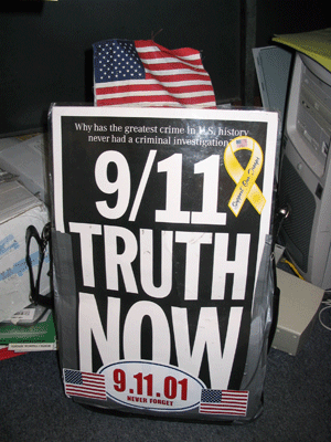 An acquaintance (not a truther) accused me jokingly of wrapping myself in the flag. That was before the latest additions--the "patriotic" style never forget sticker, the addition of smaller flag stickers, and the yellow ribbon (because hey, we want our troops supported with the truth, and either brought home or redeployed to Palestine, right...?) ;)