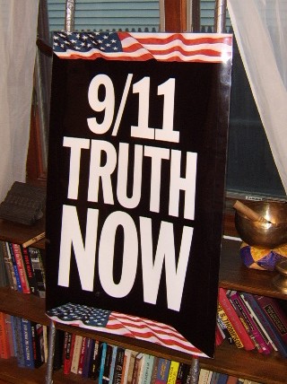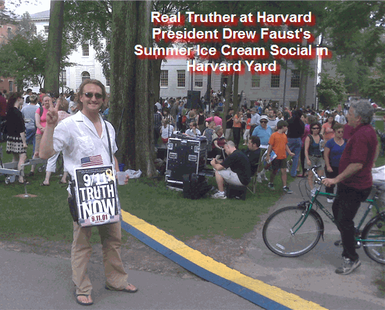 RT debuted this 24" X 36" baby in Harvard Square yesterday. He removed all the fake truth website URLs from the bottom, added a couple of ol' Glories and had Staples print and laminate it. Then, finding that the wind was blowing it around, he got a pair of tiki torches for a song at CVS to mount it on... A few people said "But RT, it isn't the 11th of the month--what are you doing out truthing??" to which RT did not reply because he was busy talking to people about 9/11 truth...