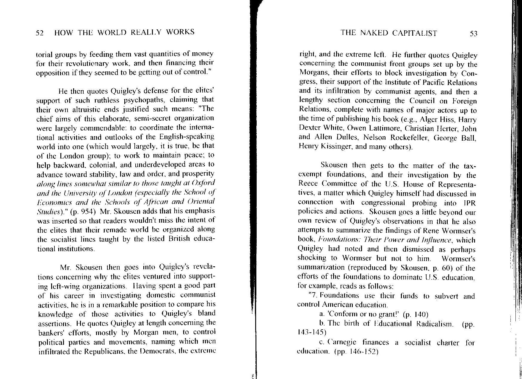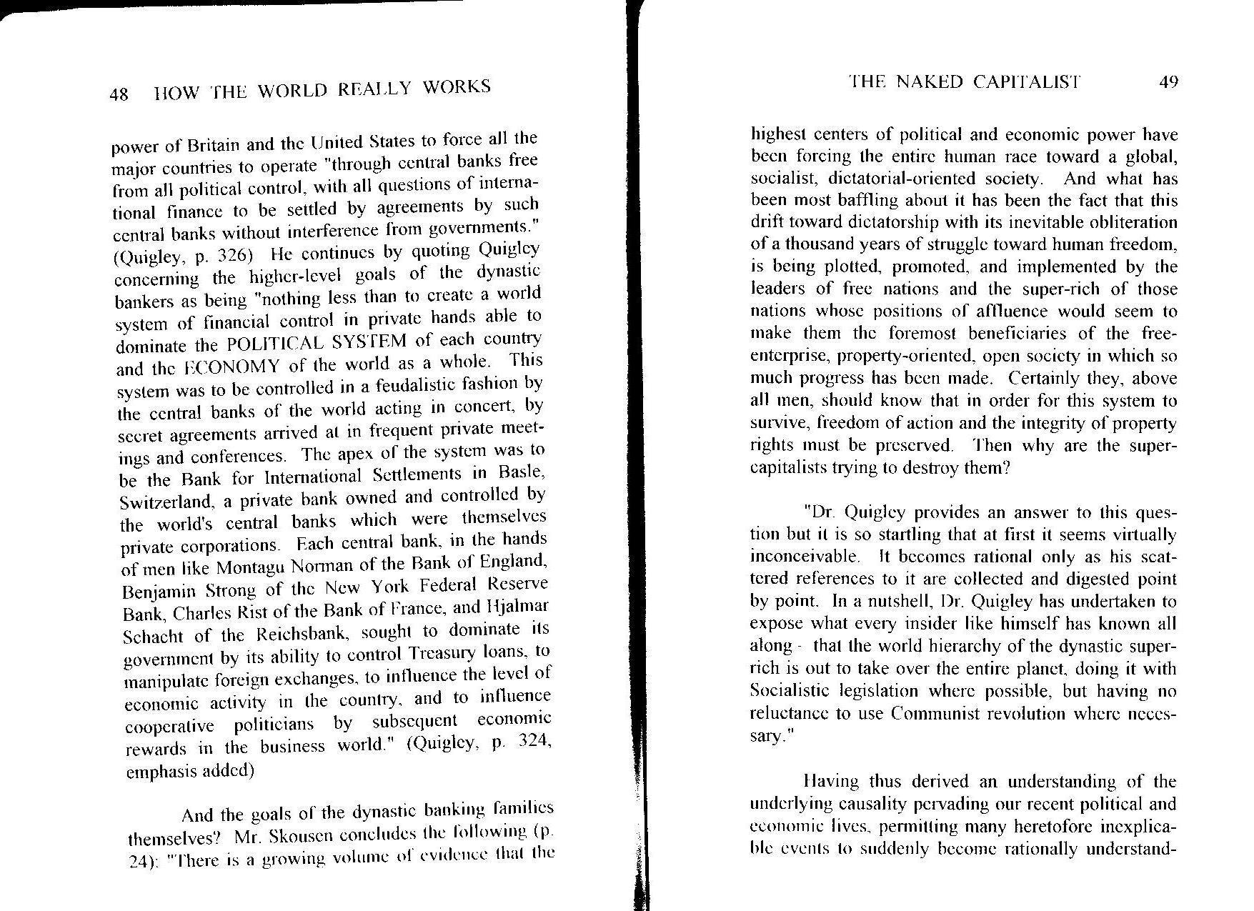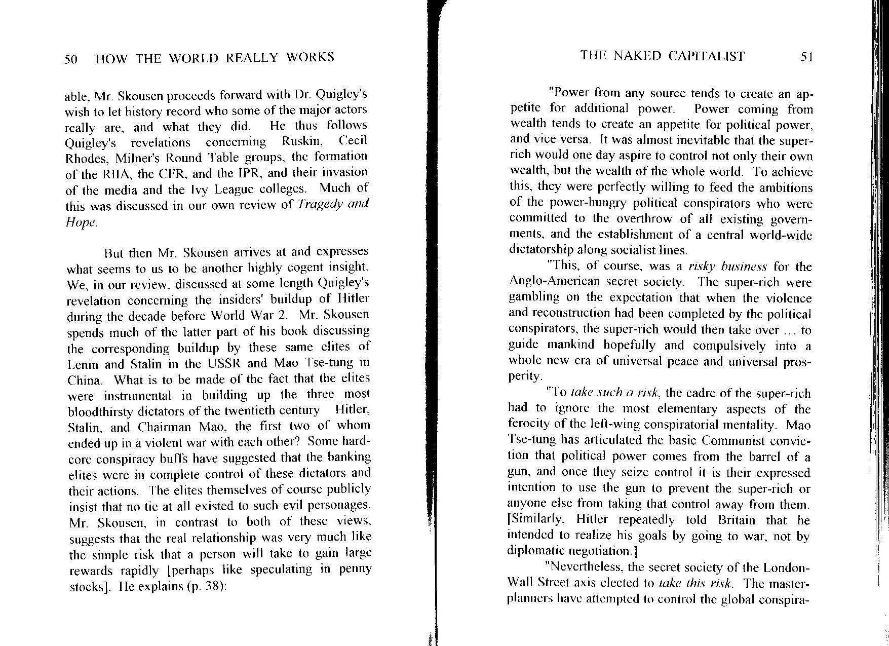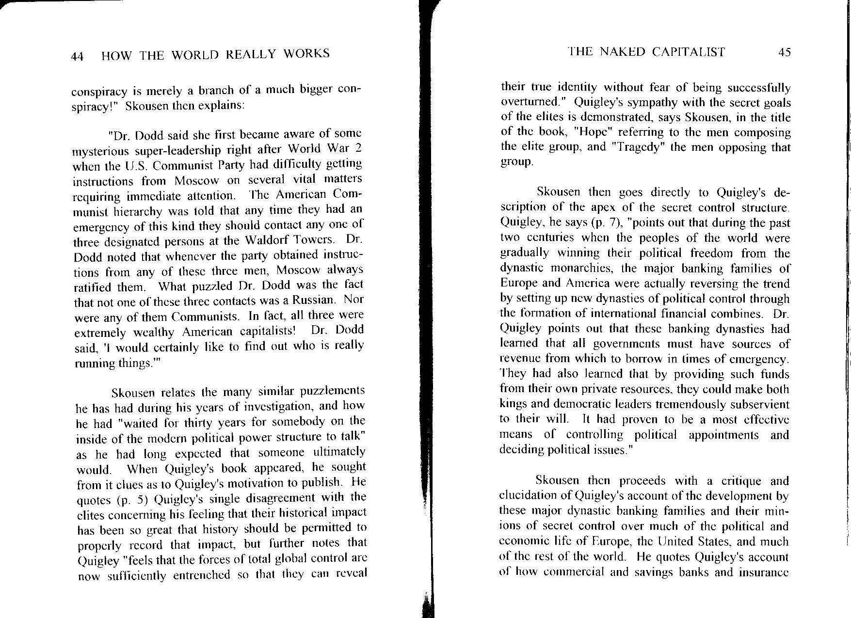 In “The Naked Capitalist†, Dr. Skousen reviews the book “Tragedy and Hope†by Carroll Quigley. It reveals how some of the richest people in the world have supported communism and socialism. Why would they support what appears to be the pathway to their own destruction? Dr. Quigley has been associated with many of these dynastic families of the super-rich. He therefore writes as an authority on the world's secret power structure. His answers to the above question may astonish you.