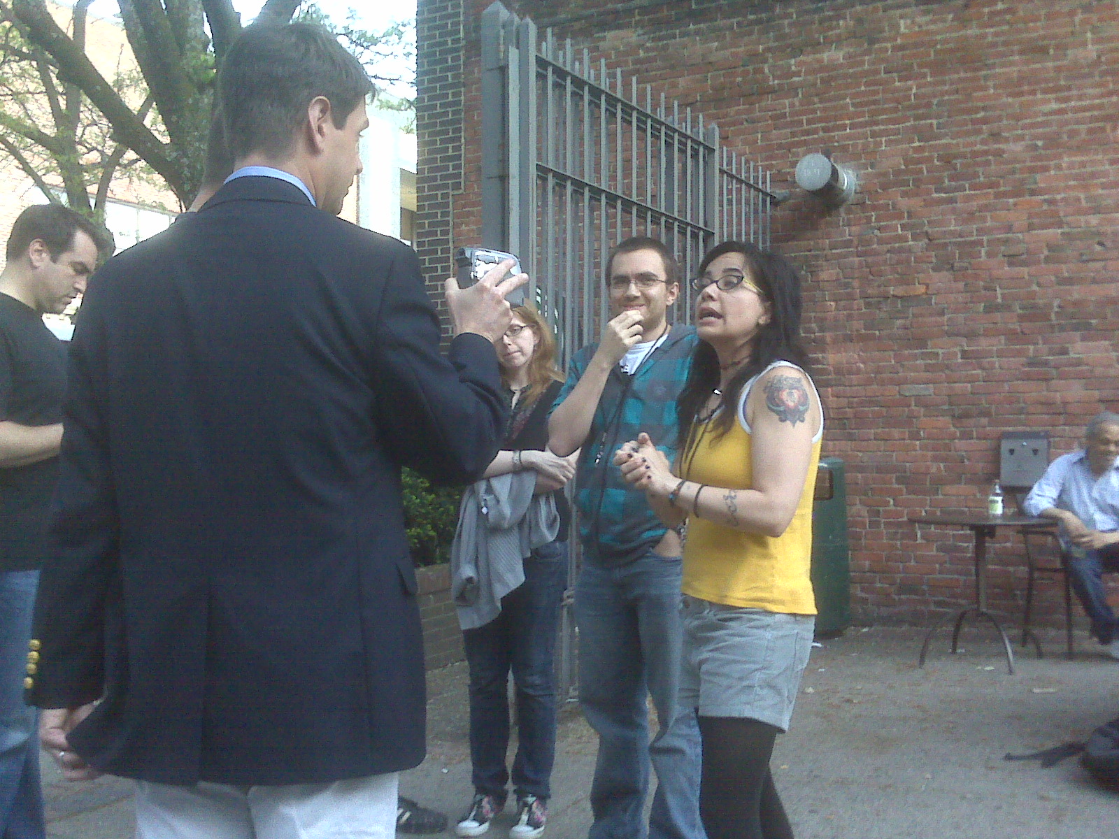 Submitted by gretavo on Sat, 2009-05-09 02:20.Took this after work today--it's Garofalo in front of Starbucks in Davis Square (Somerville, MA)--she was being ambushed by Bill OReilly goons with a camera demanding that she apologize for calling the teabaggers racists. The guy on the left of the picture is Rob Riggle (who was among those Garofalo was hanging out with,) rumored (incorrectly imho) to be Harley Guy...