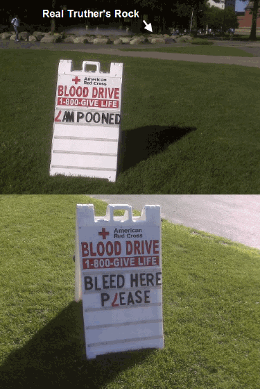 RT debuted this 24" X 36" baby in Harvard Square yesterday. He removed all the fake truth website URLs from the bottom, added a couple of ol' Glories and had Staples print and laminate it. Then, finding that the wind was blowing it around, he got a pair of tiki torches for a song at CVS to mount it on... A few people said "But RT, it isn't the 11th of the month--what are you doing out truthing??" to which RT did not reply because he was busy talking to people about 9/11 truth...