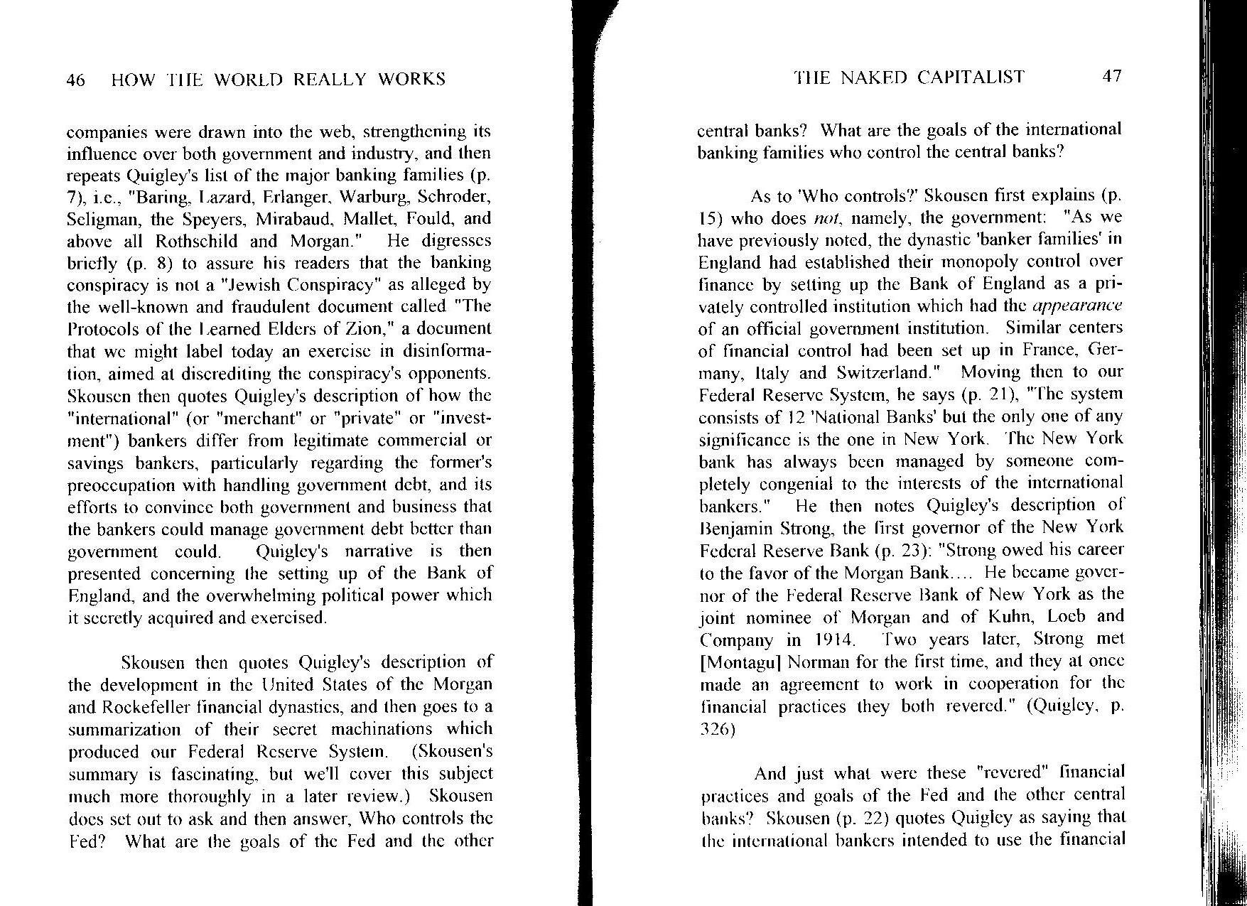 In general it's not a good idea to depend very much on a book like TRAGEDY AND HOPE. It lacks all citational references and reads in some places like disinformation of the Russo type. One of the most frequently cited phrases in Quigley's book is the claim that by end of the 19th century, the ‘far-reaching aim’ of many of the world’s leading bankers, prime among being the House of Rothschild, was to create ‘a world system of financial control in private hands able to dominate the political system of each country and the economy of the world as a whole.’ This famous quote is discussed in detail against the background of evidence dealing directly with events by Will Banyan: